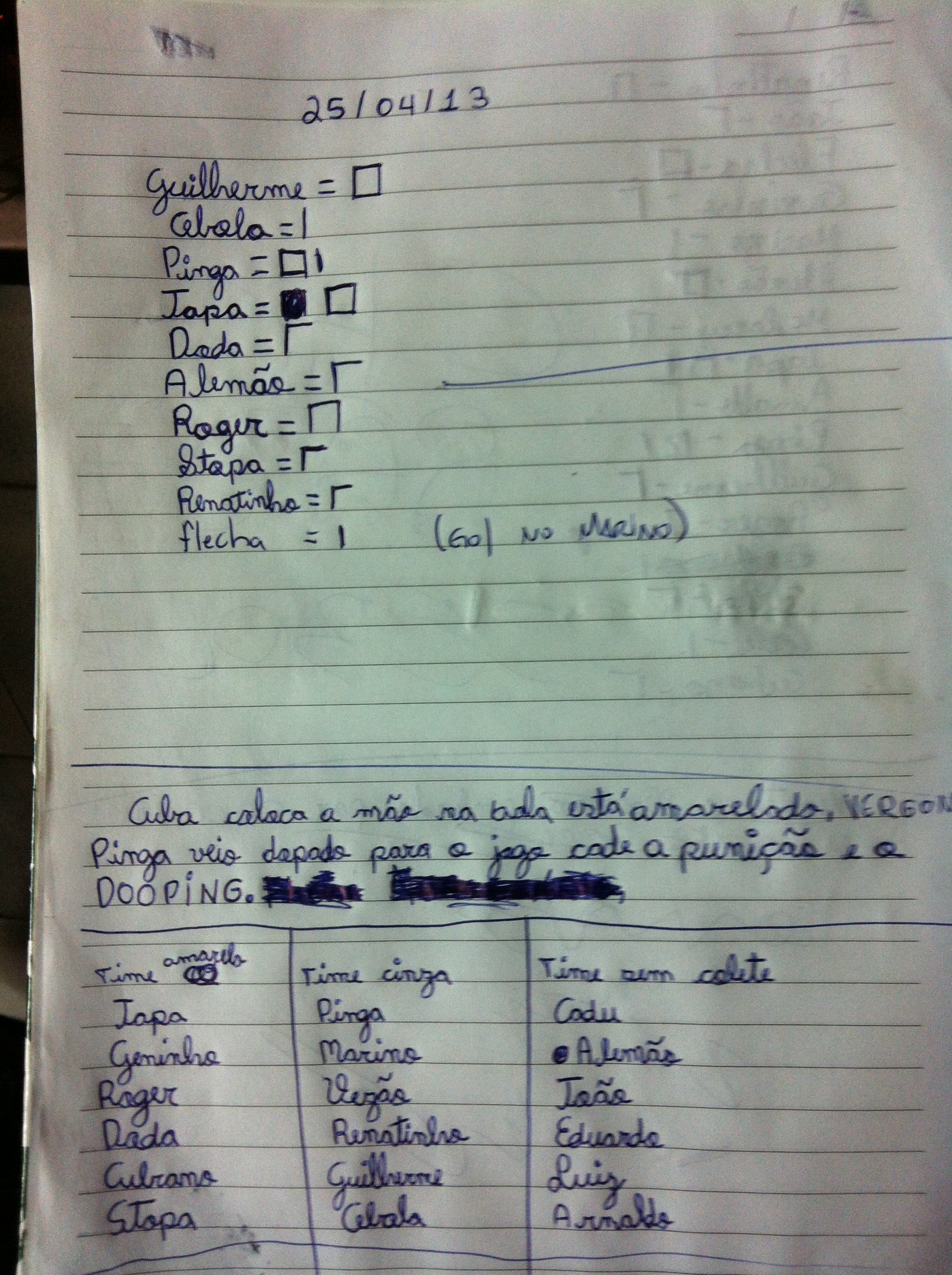- No intervalo de uma partida, na qual o time cinza havia sido eliminado, o Jogador Felipe Pinga se dirigiu até a área da churrasqueira, onde estavam localizados os membros Flecha, Paulão e Flavio ET. Ao chegar ao recinto, pediu um copo de cerveja e sentou-se à mesa à frente. Notamos uma anormal respiração ofegante e então, Flecha perguntou se estava tudo bem e se o mesmo havia parado de jogar. Foi então que o mesmo respondeu no mesmo momento, talvez acreditando que passaria impune, que estava com palpitações e de acordo com as palavras ele estava “acelerado”, pois tinha ingerido uma substância de base energética e queria “se acalmar”.